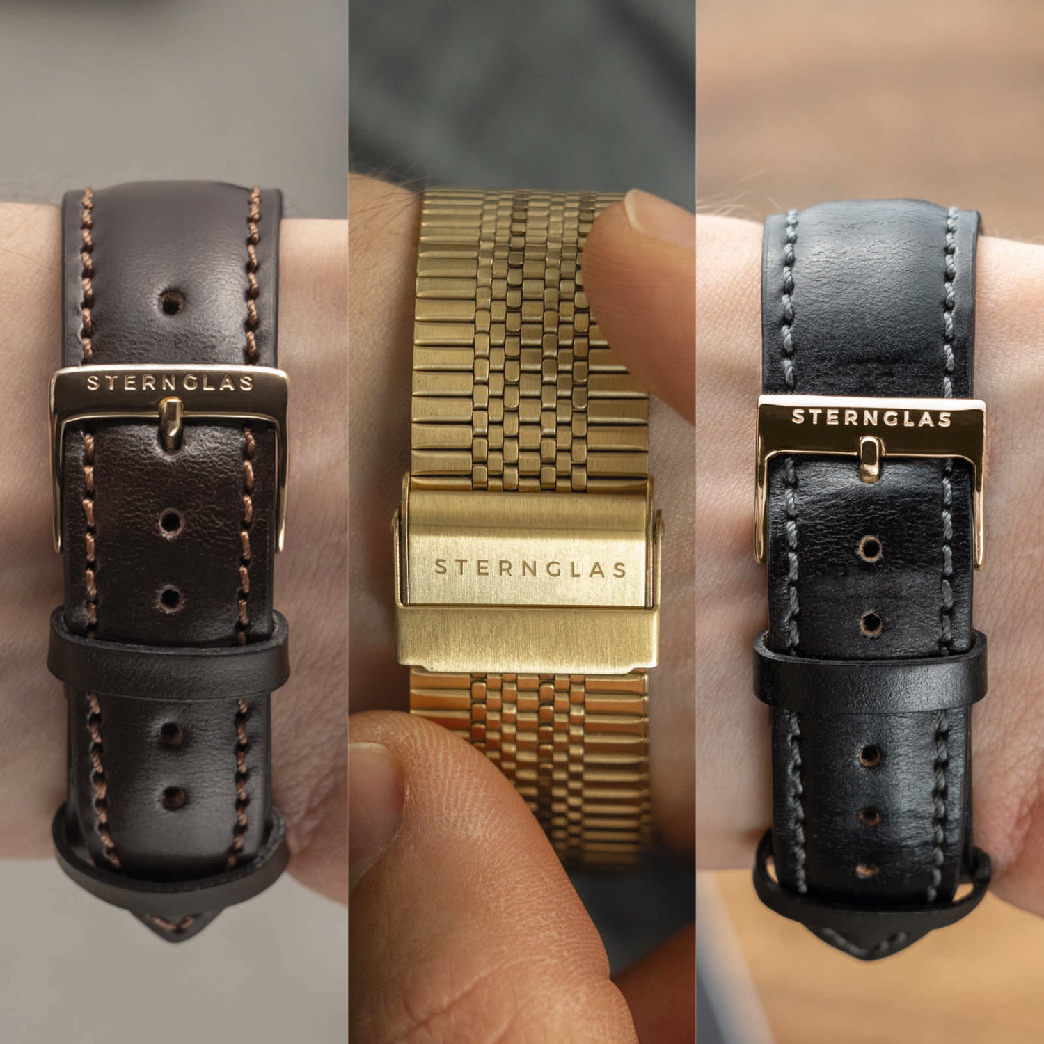 Bridle 20 (black, dark brown), Milanaise 20 (gold), SuperSlim 20 (gold), Stainless steel bracelet (316L)
