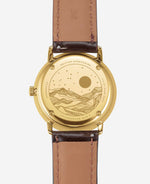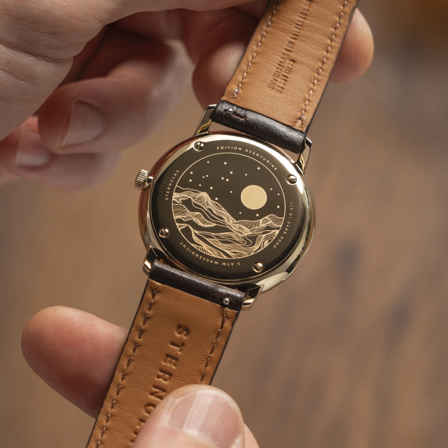 The front of this watch isn’t the only eye-catcher – the back features an artistic engraving of an abstract landscape with the moon and stars, harmoniously complementing the watch's theme.