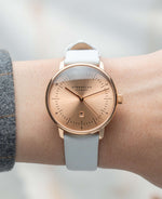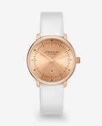 Its water and sweat resistance make it perfect for warm summer days, while the warm gold tone paired with the classic white dial also creates an elegant look on colder days.