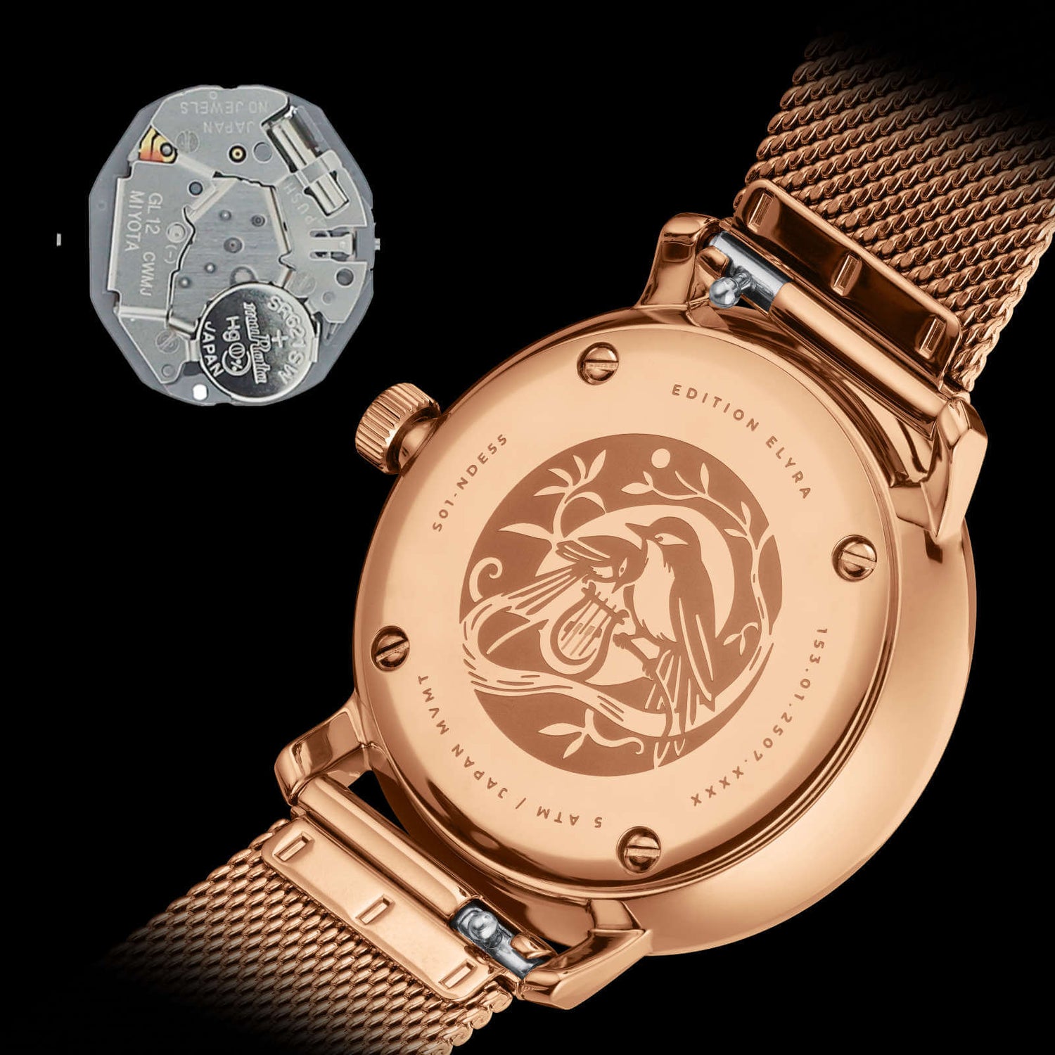 On the case back of the Naos XS Edition Elyra, a delicate engraving reveals two magpies with a harp, a nod to the Lyra of Greek mythology, a symbol of harmony and sound.