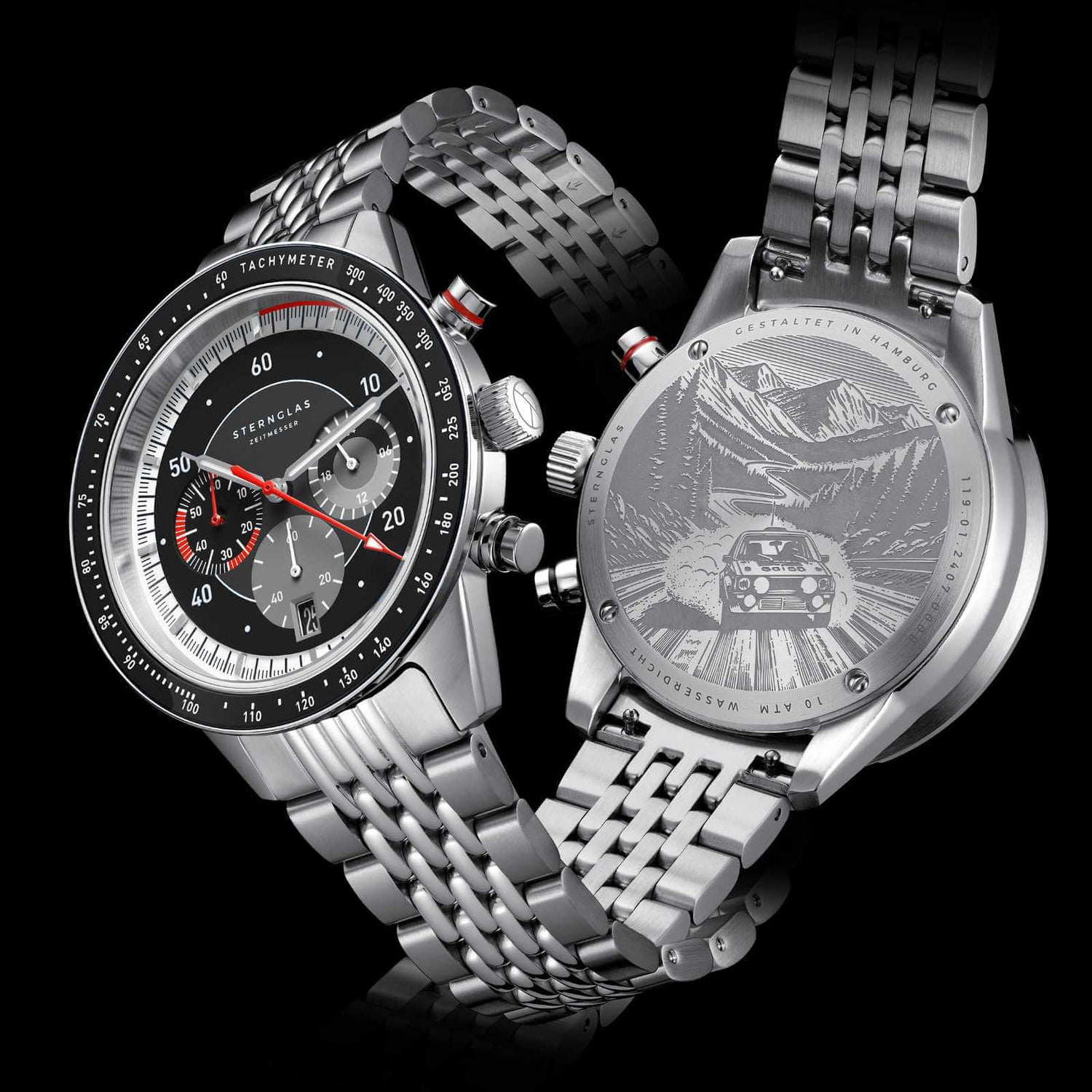 Double domed sapphire crystal with double anti-reflective coating; Multi-layer dial, Tachymeter scale, Rallye engraving